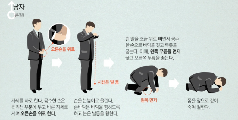 3. 절은 큰절로 2번하고 반절을 하는데, 요즘은 여성의 경우도 남자처럼 절을 해도 되고, 평절 방법으로 해도 됩니다.
